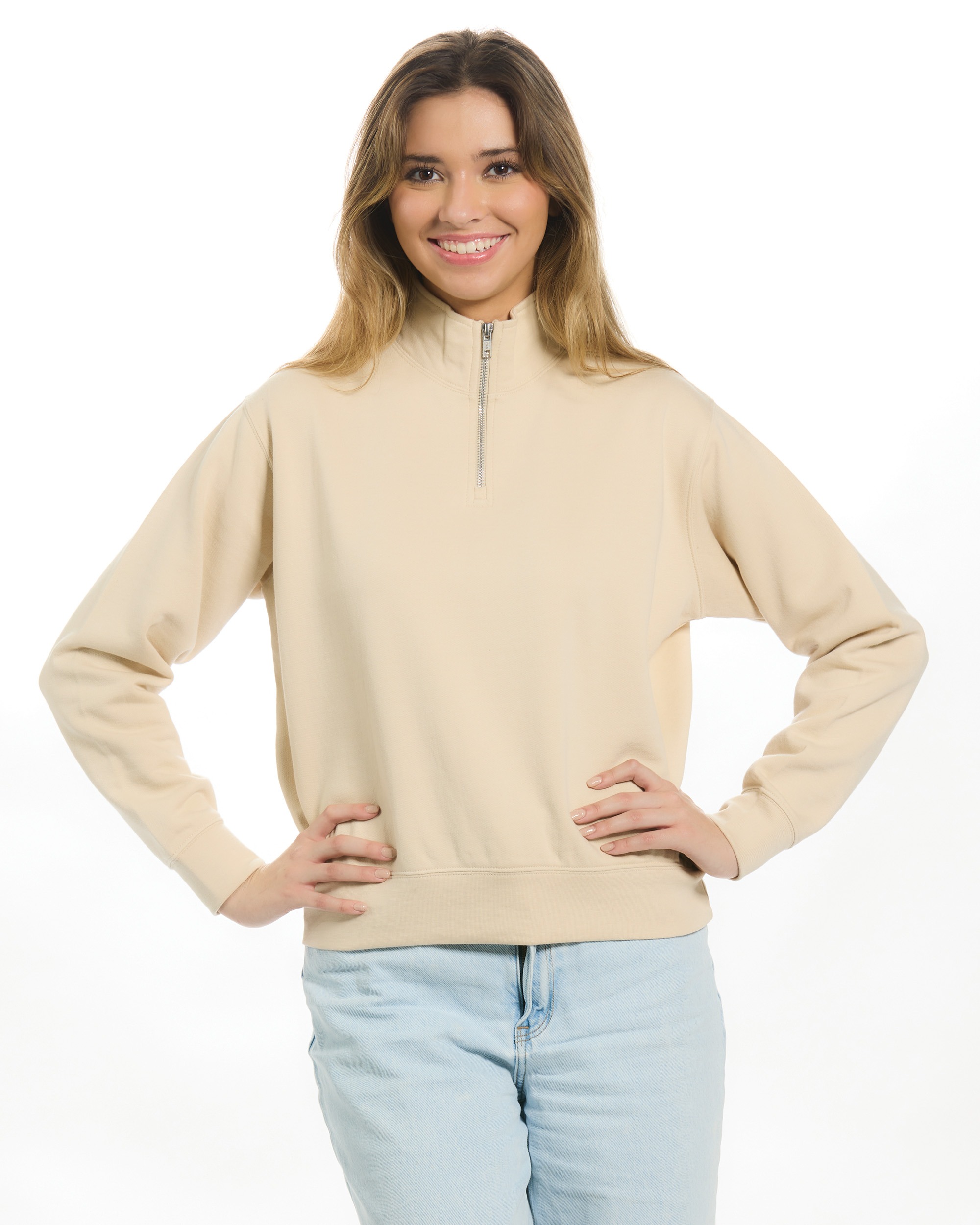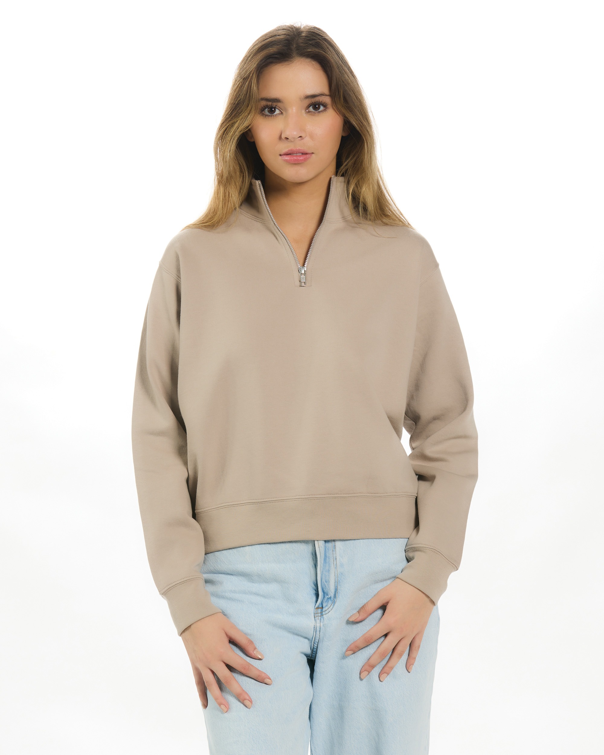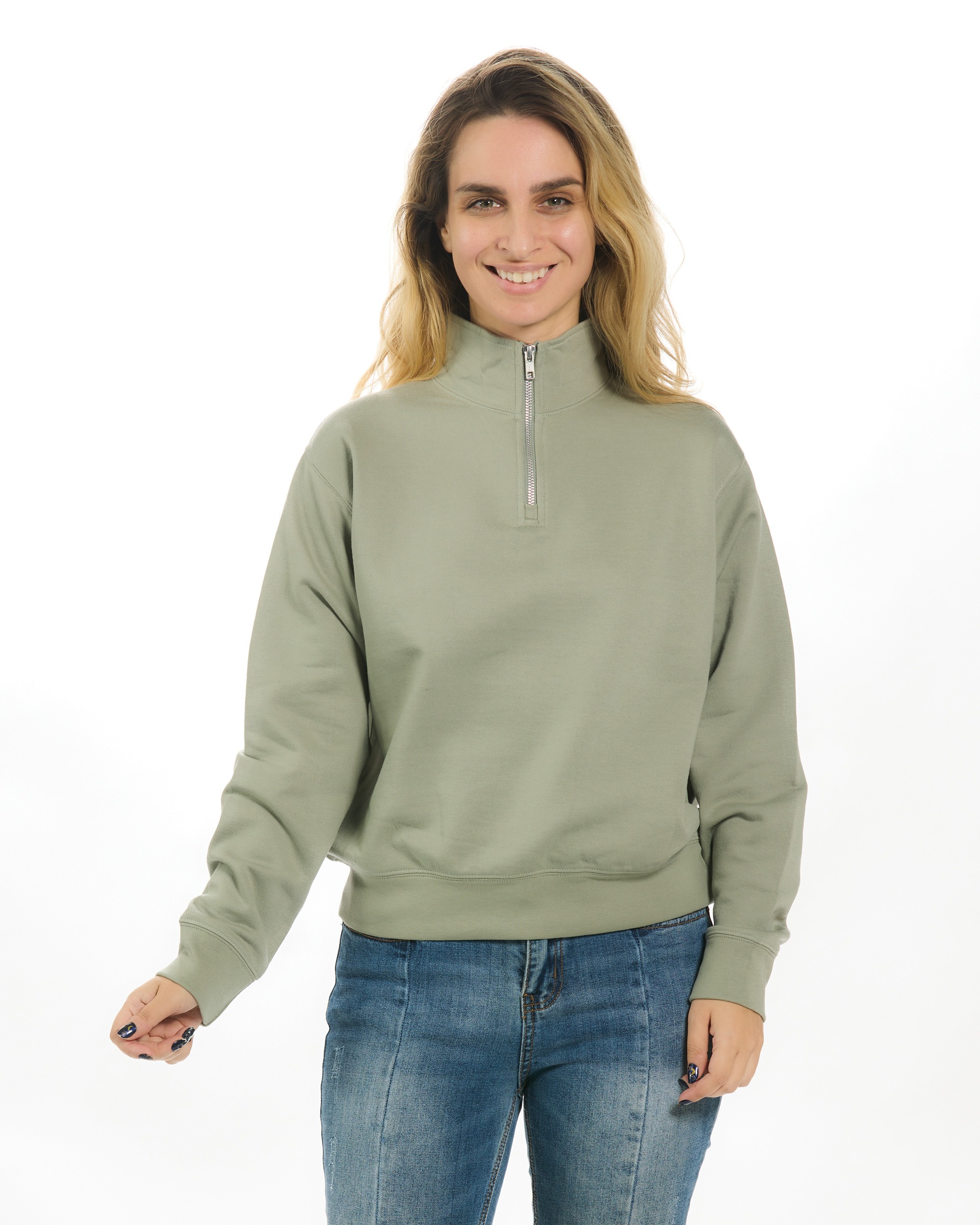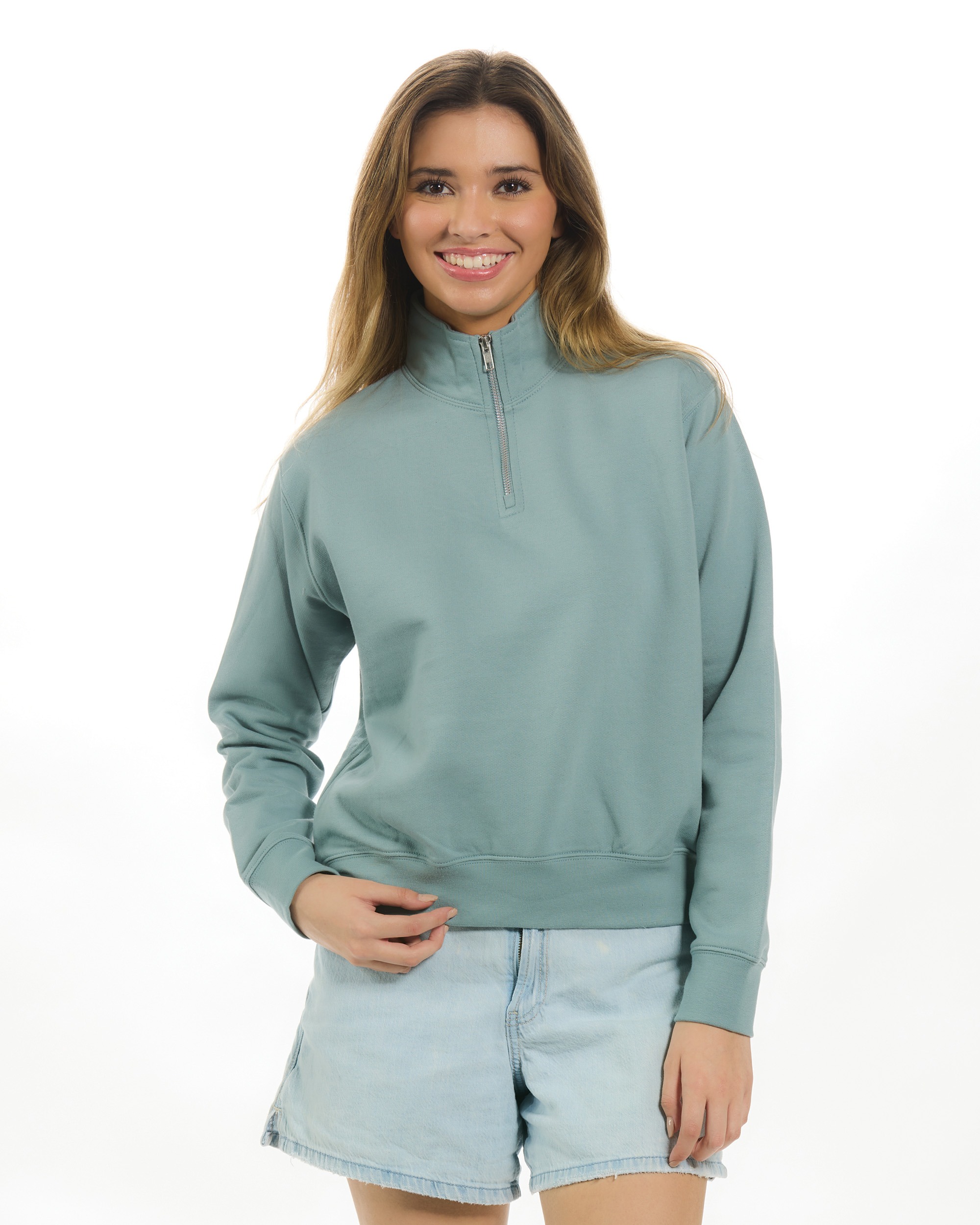 Loose fit 1/4 zip mock neck•Shorter cut length